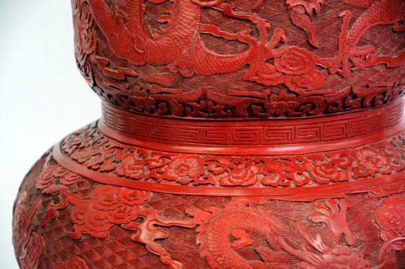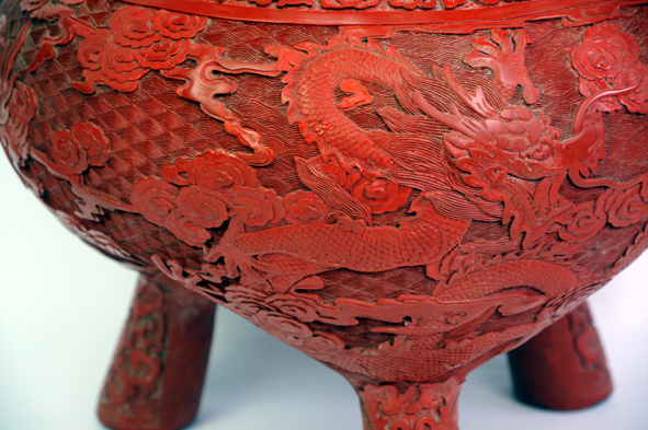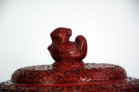 此器為仿西周中期青銅器孚公甗的造型并有所改動,甗原為蒸食用具,后來演變成古代貴族財富、地位、權利的象征。(北京雕漆工廠上世紀八十年代作品)