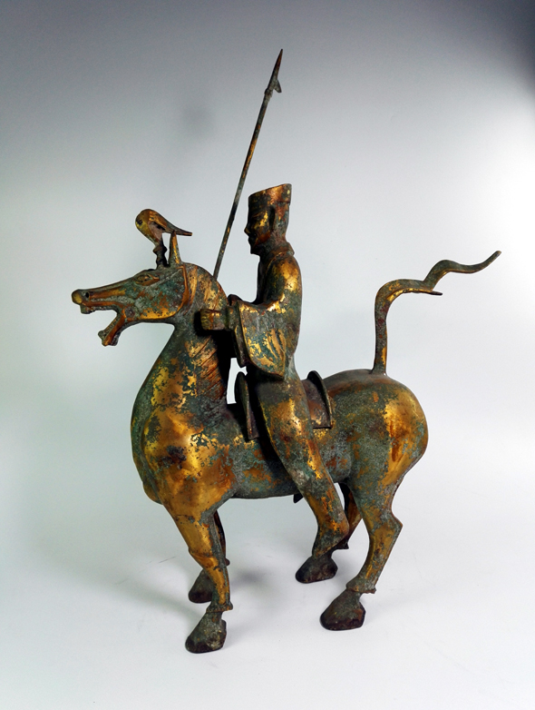 騎兵俑上身著短甲,下身著緊口褲,足蹬長筒馬靴,一手牽拉馬韁,一手提弓,陶馬背上塑鞍韉,頭上戴著絡頭、銜、韁。俑和馬的大小與真人、真馬相似,造型準確,形象逼真。馬身長約2米,通首高1.72米。騎兵俑身高1.80米,立于馬前,一手牽拉馬韁,一手作提弓狀。騎兵俑的鎧甲比步兵和車兵的甲衣短,長度僅及腰際,雙肩無護肩甲,這樣便于騎馬和操持弓弩。上衣為窄袖口,雙襟交掩于胸前,長度及膝,這樣抬腿上馬比較方便。神情自若。下身穿長褲,足登短靴,頭戴圓形小帽,帽上有帶扣結頷下。騎兵俑的服飾是秦人服飾與古之“胡服”交融歷史中最典型的例證之一。
